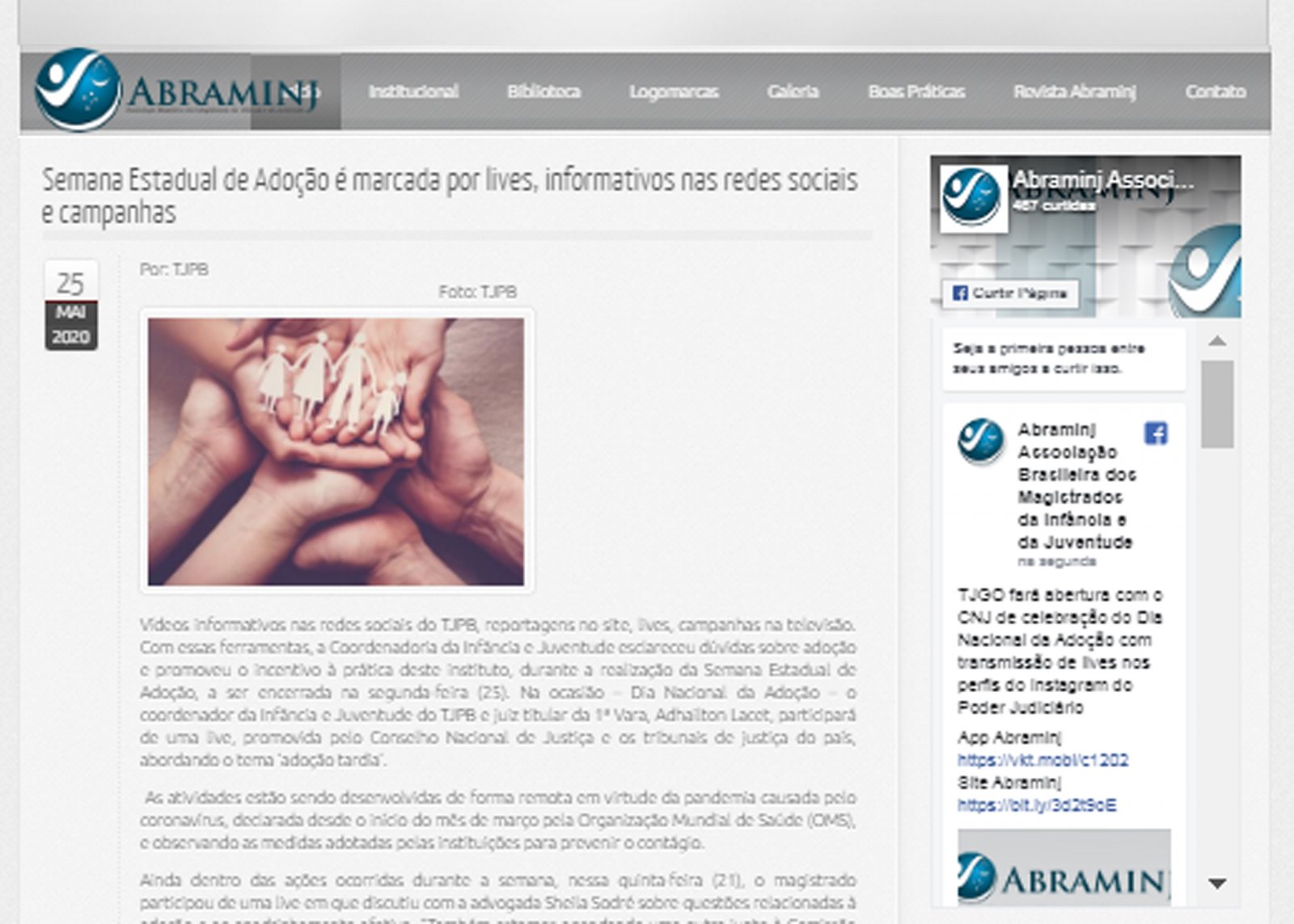 Notícia produzida pela Gerência de Comunicação do Tribunal de Justiça da Paraíba repercutiu no site da Associação Brasileira dos Magistrados da Infância e da Juventude (Abraminj). Trata-se da matéria sobre a Semana Estadual de Adoção promovida pela Coordenadoria da Infância e da Juventude (Coinju), que esse ano teve o aporte on-line em virtude do isolamento social para a prevenção à Covid-19. A reportagem foi divulgada nessa segunda-feira (25).