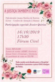 A Associação das Esposas dos Magistrados e Magistradas da Paraíba (Aemp) promoverá palestra da mastologista Joana Marisa de Barros, que vai falar sobre fatores de risco para o câncer de mama e meios de proteção. Com o tema “A Justiça também é rosa”, o evento ocorrerá no Fórum Cível de João Pessoa, no dia 16 de outubro, a partir das 17h30, e tem o apoio do Tribunal de Justiça da Paraíba, por meio da Gerência de Qualidade de Vida. Haverá participação especial do humorista Jessier Quirino.