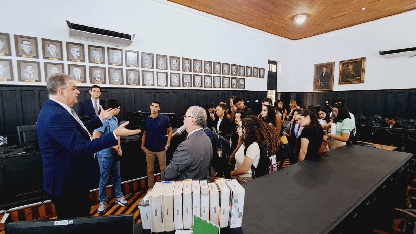 O presidente Fred Coutinho recepcionou os estudantes na sala do Museu do Poder Judiciário, onde está localizada a Galeria dos desembargadores que assumiram o Governo do Estado da Paraíba. A vinda dos alunos à sede do TJPB foi em resposta ao convite feito pelo desembargador Fred, na ocasião em que ministrou a aula magna inaugural da turma no mês passado.