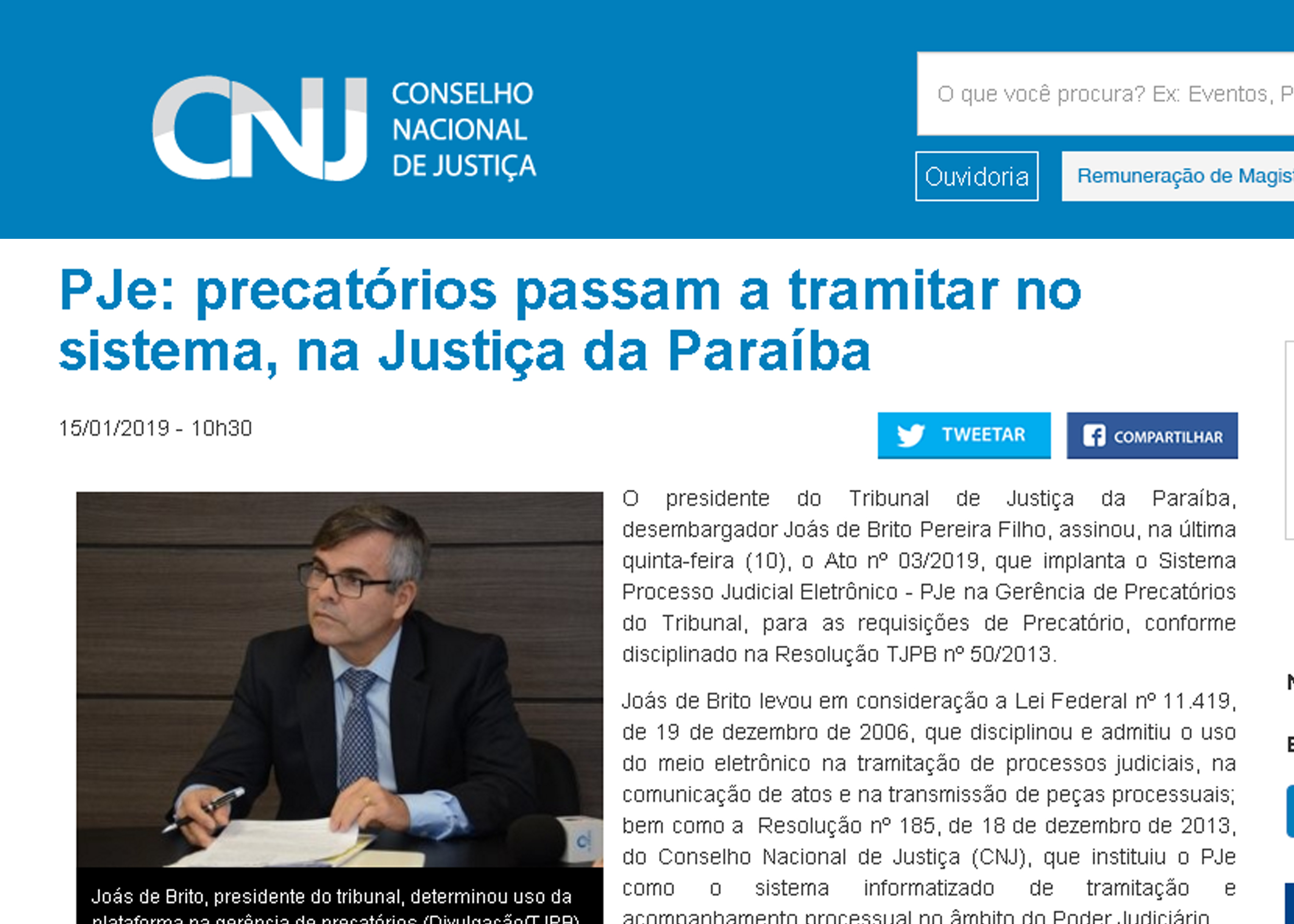 A notícia publicada no Portal do CNJ, divulgada pela Diretoria de Comunicação do TJPB, revela que o presidente do Tribunal de Justiça da Paraíba, desembargador Joás de Brito Pereira Filho, assinou, na quinta-feira (10), o Ato nº 03/2019, que instalou o sistema do PJe na Gerência de Precatórios, conforme disciplinado na Resolução TJPB nº 50/2013. O expediente foi publicado na edição do DJe do dia 11.