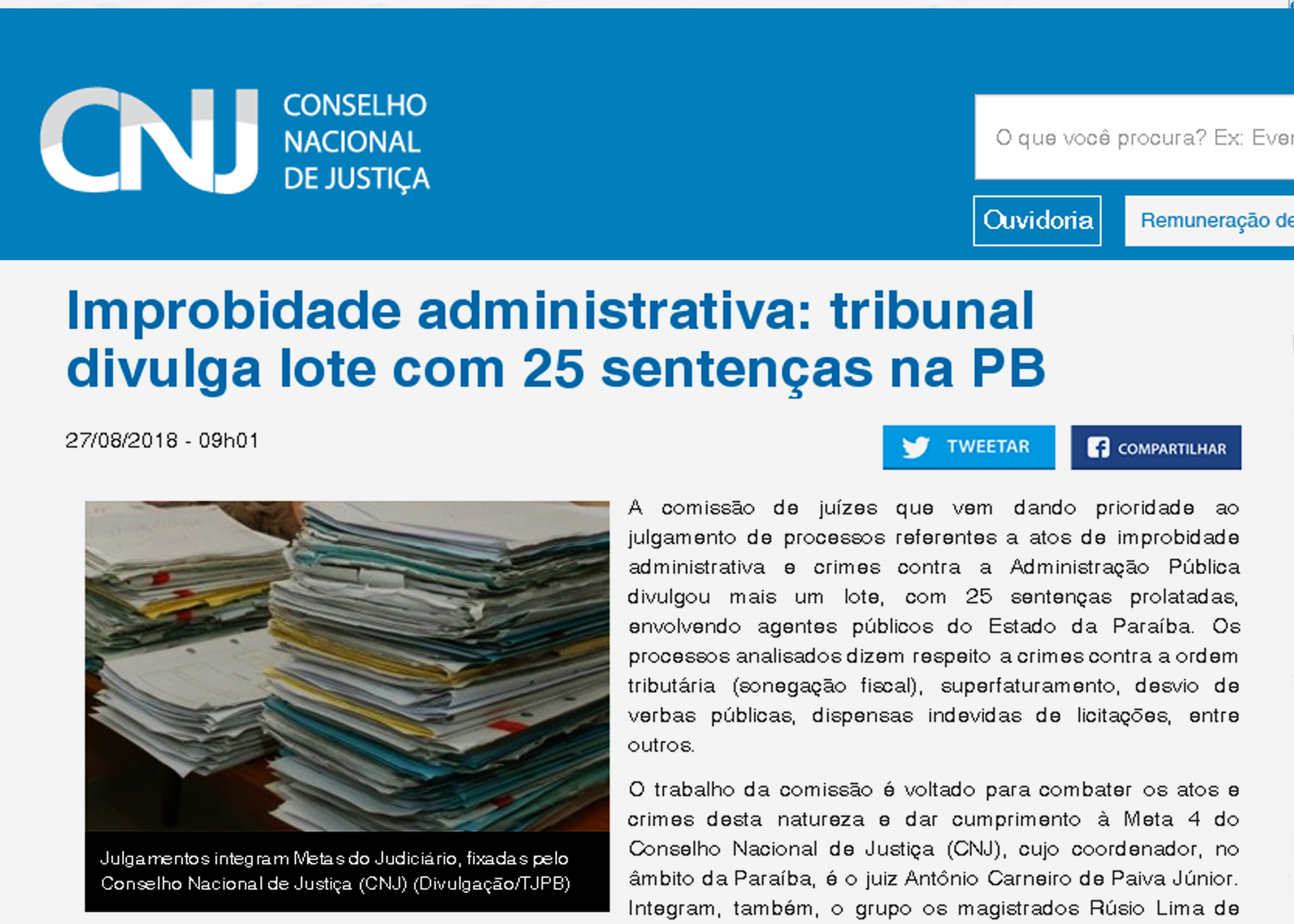 O portal do Conselho Nacional de Justiça (CNJ) divulgou, nesta segunda-feira (27), na seção ‘Notícias dos Tribunais’, mais uma ação do Tribunal de Justiça da Paraíba. Esta diz respeito à divulgação de outro lote de sentenças da Meta 4 do CNJ, referente a julgamento de processos atinentes a atos de improbidade administrativa e crimes contra a Administração Pública.