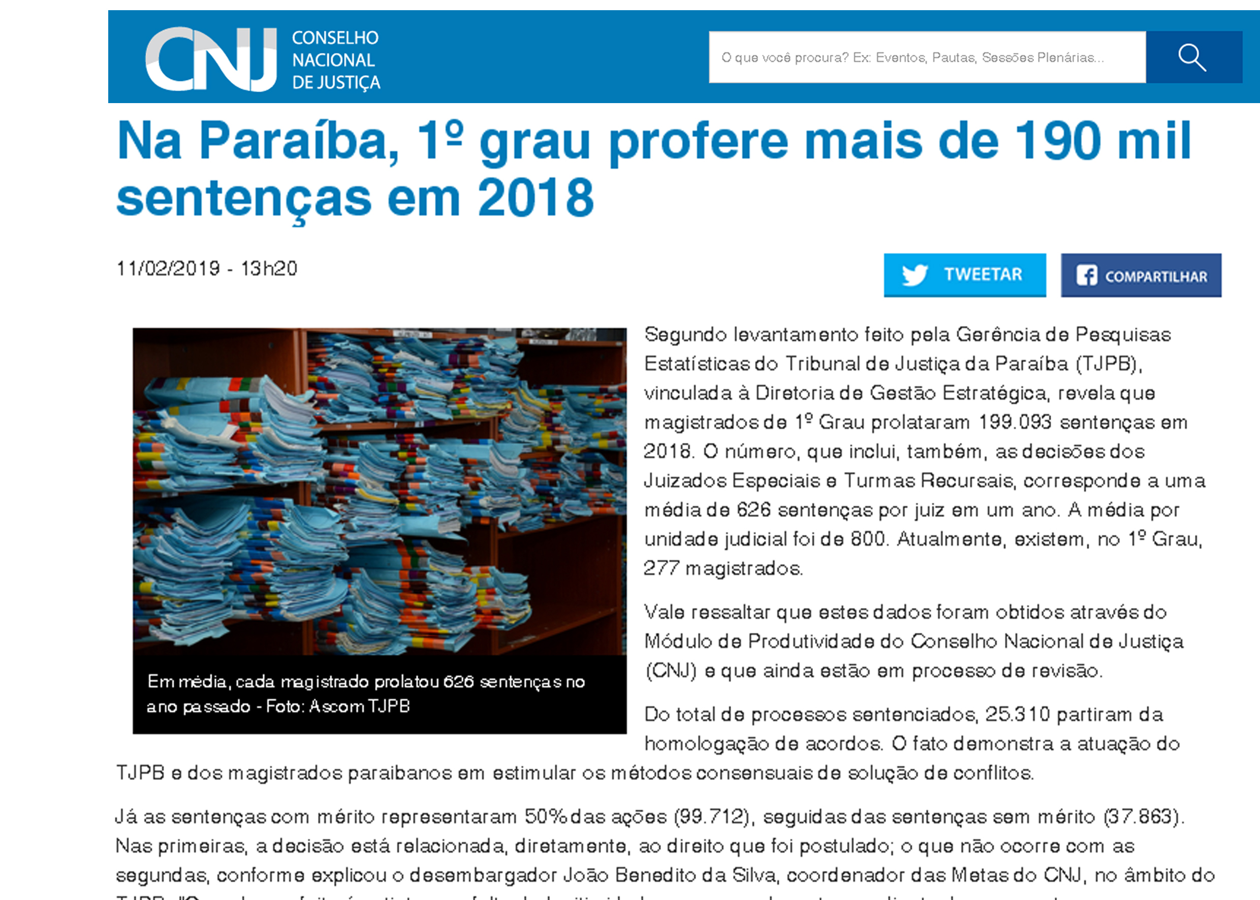 A produtividade da magistratura paraibana do 1º grau de jurisdição no ano de 2018 foi assunto retratado no Portal de Notícias do Conselho Nacional de Justiça (CNJ) nesta segunda-feira (11). Os números levantados pelo setor de Pesquisas Estatísticas do Tribunal de Justiça da Paraíba e obtidos pelo Módulo de Produtividade do CNJ demonstram que, no período, foram prolatadas 199.093 sentenças, correspondente a 626 por juiz.