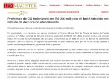 Especializado em publicações jurídicas, o portal Lex Magister postou, nesta quarta-feira (5), matéria produzida pela Diretoria de Comunicação Institucional do TJPB sobre decisão tomada pelos membros da Primeira Câmara Cível do Tribunal de Justiça da Paraíba, na sessão dessa terça-feira (4). Na ocasião, o Órgão Fracionário condenou a Prefeitura Municipal de Campina Grande ao pagamento de R$ 300 mil, a título de danos morais, pela omissão médica em hospital da municipalidade, fato que gerou o falecimento de um bebê em virtude da demora no atendimento adequado.