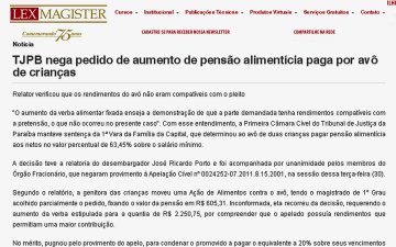 Matéria sobre decisão da Primeira Câmara Cível do Tribunal de Justiça da Paraíba, que negou pedido de aumento de pensão alimentícia paga por avô de crianças, é destaque no portal Lex Magister, especializado em assuntos jurídicos. A publicação ocorreu nesta quinta-feira (1º), em sua página principal. A reportagem foi produzida pela Diretoria de Comunicação do Tribunal de Justiça da Paraíba e postada nessa quarta-feira (31) no portal do TJPB.