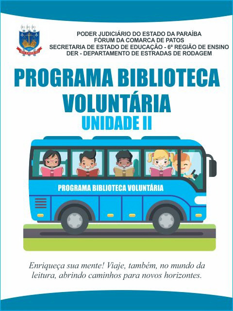 Na semana em que é comemorado o Dia Internacional do Livro, os servidores do Poder Judiciário estadual Teresinha Vita de Sousa Queiroz (técnica judiciária), Edson dos Santos (auxiliar administrativo) e Getúlio Luiz Camboim (gerente do Fórum da Comarca de Patos) estão lançando o Programa ‘Biblioteca Voluntária Unidade II’, que será instalado no Terminal Rodoviário da cidade na próxima segunda-feira (29).Os passageiros poderão desfrutar de conhecimentos, levar os livros para casa e fazer doações de obras para o acervo da biblioteca. “Mais um trabalho voluntário levando cultura no dia a dia dos transeuntes”, ressaltou Teresinha.