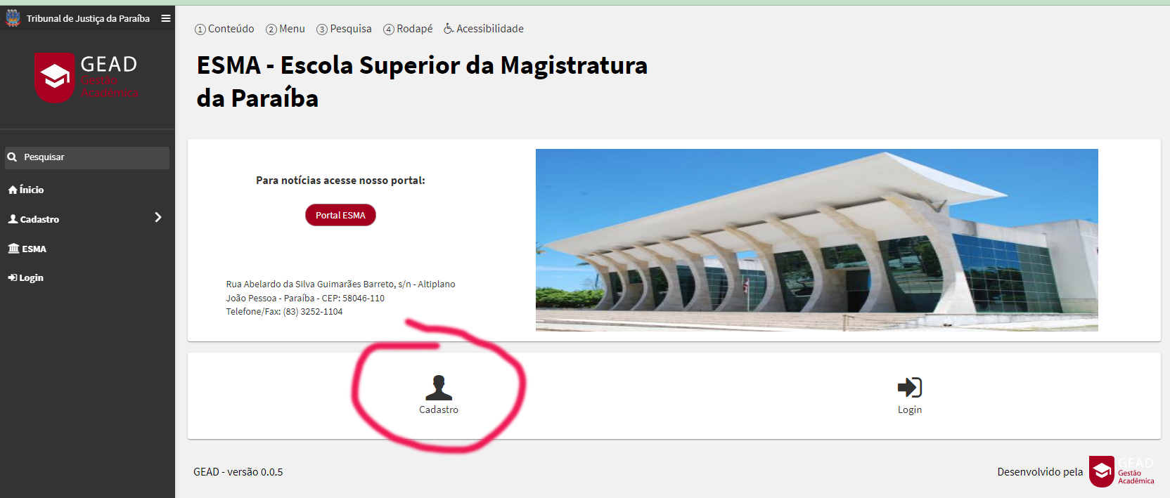 A Gerência Acadêmica e de Formação e Aperfeiçoamento de Servidores da Escola Superior da Magistratura (Esma) está convidando servidores e servidoras do Poder Judiciário estadual e o público em geral para fazerem seus cadastros no sistema de Gestão Acadêmica (GEAD). Na plataforma, o interessado deverá preencher o formulário de cadastro para, em seguida, ter acesso aos links de inscrições dos cursos ofertados pela instituição de ensino.