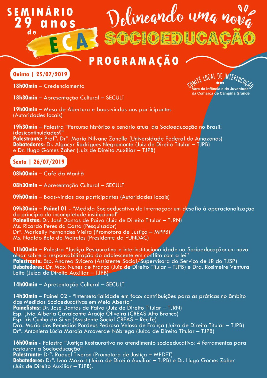 “29 anos do ECA: delineando uma nova Socioeducação”. Esse é o tema do Seminário que acontecerá na próxima semana (dias 25 e 26) em Campina Grande. O evento é organizado pela Vara da Infância e Juventude de Campina Grande, por meio do Comitê Local de Interlocução (CLI), em parceria com a Rede Municipal. Discutirá os avanços do Estatuto da Criança e do Adolescente (ECA), nos últimos 29 anos, abordando o aspecto da socioeducação. As palestras serão ministradas na Uninassau.