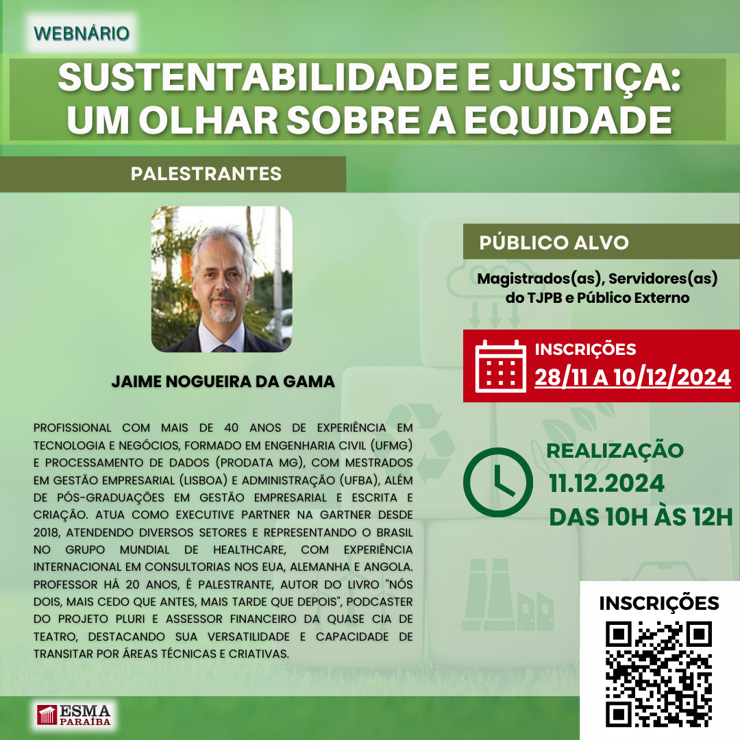 Magistrados(as) servidores(as) do Poder Judiciário estadual e o público em geral têm até esta terça-feira (10), para se inscreverem no Webinário "Sustentabilidade e Justiça: Um olhar sobre a Equidade". O evento digital, que ocorrerá das 10h às 12h, é promovido pelo Núcleo Socioambiental do Tribunal de Justiça da Paraíba, com apoio da Escola Superior da Magistratura (Esma). A inscrição pode ser feita direcionando a câmera do celular para o QR CODE constante no banner do evento.