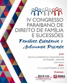 Com o tema Famílias, Cidadania e Autonomia Privada, o IV Congresso Paraibano de Direito de Família e Sucessões será realizado nos dias 12 e 13 de setembro, no auditório da Escola Superior da Magistratura (Esma), em João Pessoa-PB, sob a organização do Instituto Brasileiro de Direito de Família e Sucessões – seção Paraíba (IBDFAM-PB), com apoio do Tribunal de Justiça da Paraíba e da Escola.