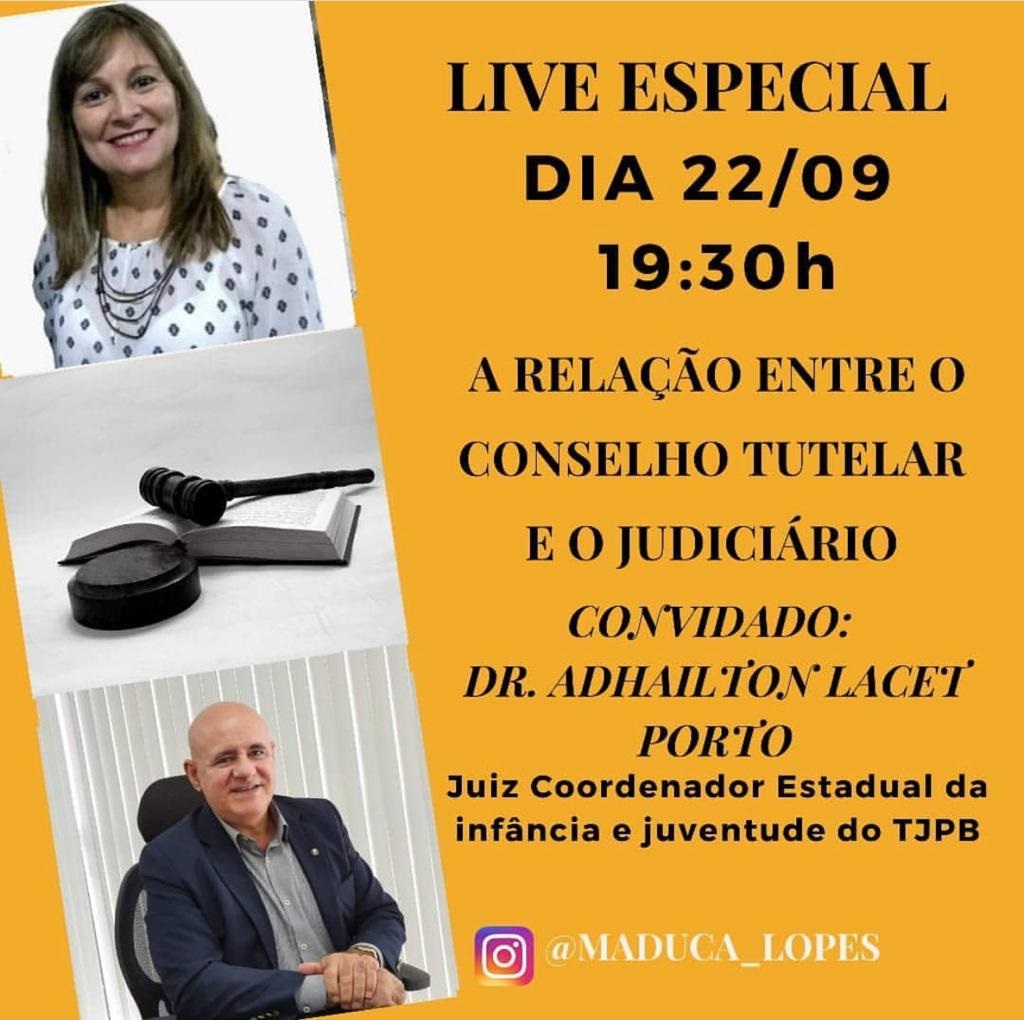 “A relação entre o Conselho Tutelar e o Judiciário” é o tema a ser abordado pelo coordenador da Infância e da Juventude (Coinju) do Tribunal de Justiça da Paraíba e titular da 1ª Vara da Infância e Juventude da Capital, juiz Adhailton Lacet, durante live que será realizada no próximo dia 22. A transmissão ao vivo poderá ser assistida a partir das 19h30 através do perfil da conselheira tutelar Maduca Lopes (@maduca_lopes), que atua no Estado de São Paulo e é conhecida, também, por ser autora de variados livros sobre a temática.
