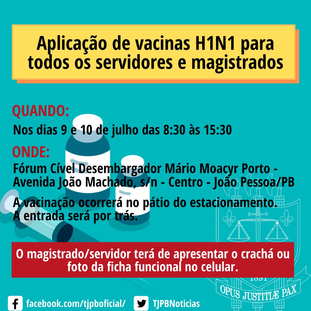 Nesta quinta (9) e sexta-feira (10), das 8h às 15h30, magistrados e servidores do Poder Judiciário estadual serão imunizados contra a gripe influenza (H1N1). Para evitar aglomeração, a vacinação ocorrerá em modelo drive thru na área externa do pátio do estacionamento do Fórum Cível “Desembargador Mário Moacyr Porto”, localizado na Avenida João Machado, Centro de João Pessoa.