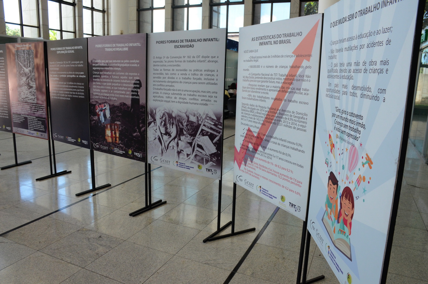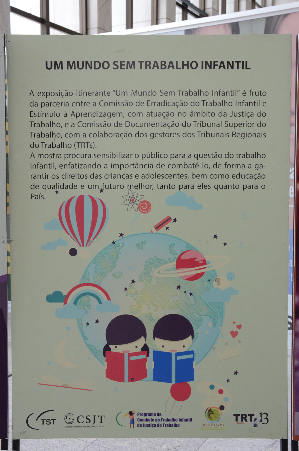 ‘Um Mundo sem Trabalho Infantil’. Este é o tema da exposição itinerante, que aborda as diversas formas de exploração do trabalho envolvendo crianças e adolescentes. Com 16 painéis, medindo 1,80m x 1,00m, dispostos no hall de entrada do Fórum Cível de João Pessoa, a mostra recebeu, nesta terça-feira (20), a visita do presidente do Tribunal de Justiça da Paraíba, desembargador Joás de Brito Pereira Filho, e do juiz Adhailton Lacet, gestor da Coordenadoria da Infância e da Juventude do TJPB (Coinju).