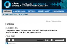 O incentivo do Tribunal de Justiça da Paraíba e a adesão dos blocos do Folia de Rua à Campanha ‘Meu corpo não é sua folia’ foi destaque de programa da Rádio Justiça do Supremo Tribunal Federal. A matéria foi ao ar às 10h desta quinta-feira (23).