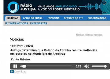 Reportagem veiculada nessa segunda-feira (13) pela Rádio Justiça, do Supremo Tribunal Federal (STF), relata uma decisão do judiciário paraibano, determinando que o Governo do Estado realize melhorias em escolas no Município de Aroeiras.
