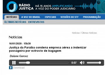 Rádio Justiça divulga decisão da justiça paraibana sobre indenização por extravio de bagagem