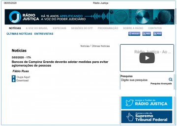 A Rádio Justiça do Supremo Tribunal Federal (STF) divulgou notícia produzida pela Gerência de Comunicação do Tribunal de Justiça da Paraíba nessa terça-feira (5), às 17h. A matéria é sobre a obrigatoriedade das agências do Itaú Unibanco, do Banco Santander e do Banco do Brasil, na cidade de Campina Grande, adotarem medidas para evitar aglomerações de pessoas, inclusive nas partes externas dos estabelecimentos. A decisão foi da juíza Ritaura Rodrigues Santana, da 1ª Vara Cível de Campina Grande, nos autos da Ação Civil Pública nº 0807740-81.2020.8.15.0001 movida pela Defensoria Pública do Estado da Paraíba.
