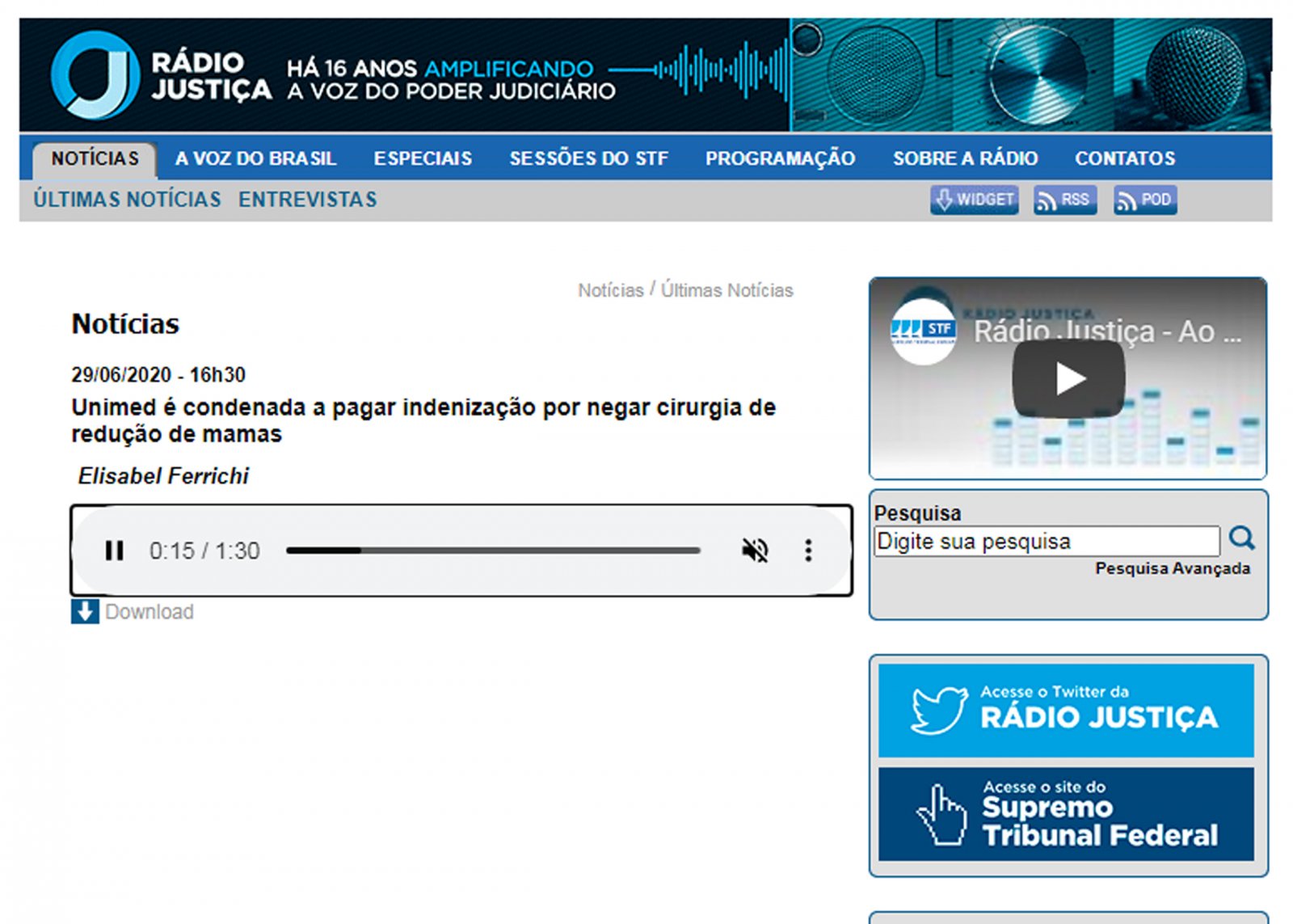 A Rádio Justiça do Supremo Tribunal Federal (STF) repercutiu a decisão da Terceira Câmara Cível do Tribunal de Justiça da Paraíba que condenou a Unimed João Pessoa ao pagamento de uma indenização, a título de danos morais, no valor de R$ 5 mil, em razão da negativa de cobertura para realização de uma cirurgia de redução de mamas (mamoplastia). A notícia foi divulgada nessa segunda-feira (29), às 16h30, baseada em matéria produzida pela Gerência de Comunicação do TJPB.
