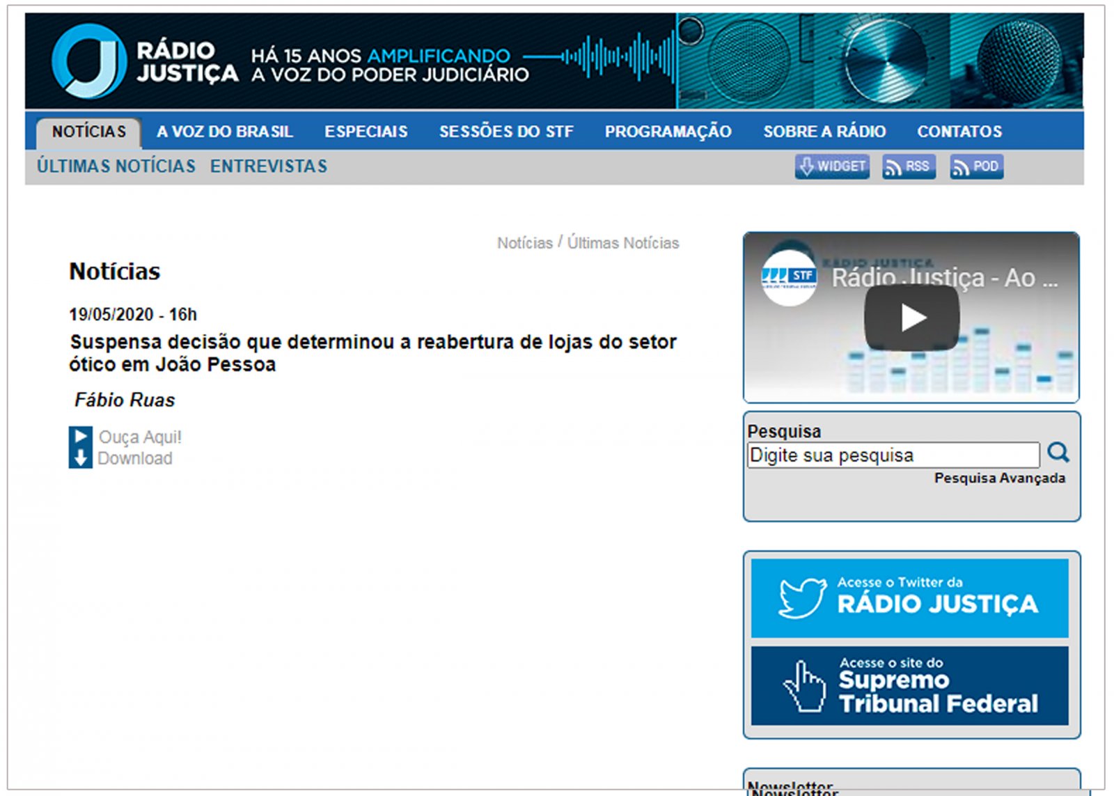 A Rádio Justiça do Supremo Tribunal Federal repercutiu, nessa terça-feira (19), decisão do desembargador Luiz Silvio Ramalho Júnior, que deferiu pedido de liminar para sustar os efeitos da decisão de 1º Grau, autorizando a reabertura dos estabelecimentos que exploram o comércio varejista de material óptico na cidade de João Pessoa. A determinação atendeu a uma solicitação do Município de João Pessoa, que ingressou com o Agravo de Instrumento nº 0806246-87.2020.8.15.0000.