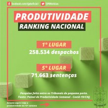 Despachos – O Ranking aponta o seguinte comportamento deste dados: na primeira semana (16/03 a 22/03), foram realizados 21.589, na segunda semana, 22.758. Na terceira, a média se manteve, chegando a 20.719. Na quarta semana, houve 12.559, seguidos de 22.358 na quinta semana e 17.597 na sexta. Na sétima, o número foi 17.910; na oitava, ficou em 18.839, na nona, 22.248. Na décima, 19.362 despachos foram proferidos, enquanto que na 11ª, o número aumentou para 21.314. Um total de 21.361 despachos foram contabilizados na 12ª semana.